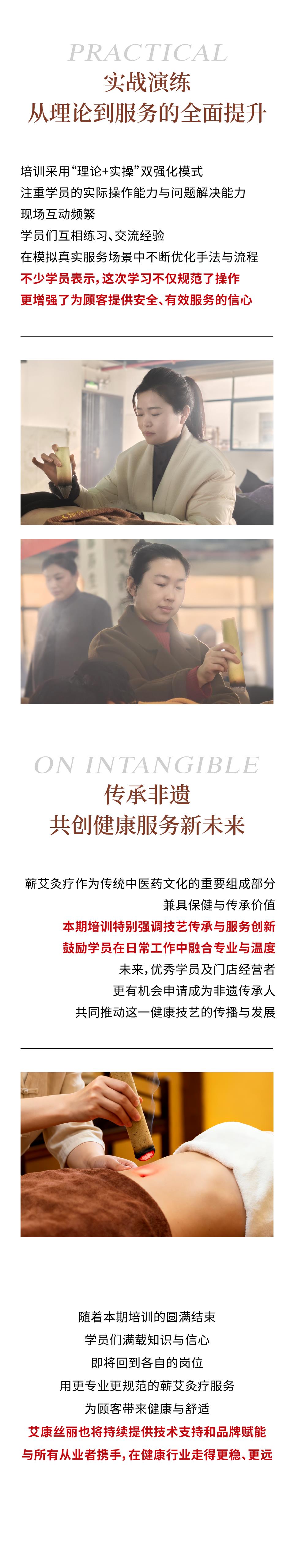 本期培训为期三天,采用了“理论+实操”相结合的双强化教学模式。培训内容全面,涵盖蕲艾文化、灸疗理论、实操手法、穴位定位、服务规范等核心知识与技能。在现场,学员们通过多轮互动演练和模拟真实服务场景,不断优化操作流程,旨在实现从专业理论到服务能力的全面提升。